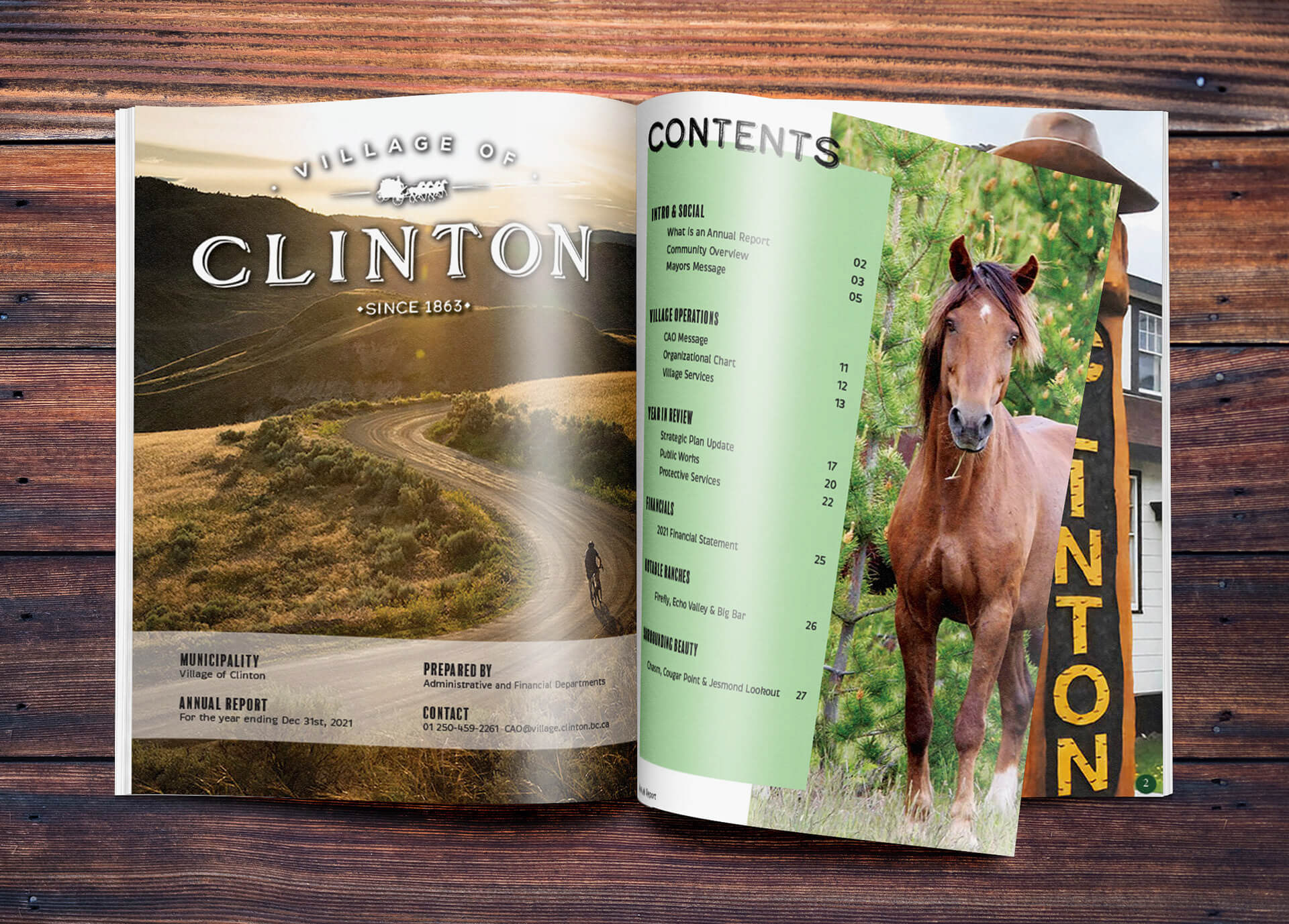 Some favourite pages from an academic project to redo an existing annual report; I chose to do the Village of Clinton—a rural town in the Cariboo region of BC. It is considered "the gateway to the Cariboo" and my goal was to highlight the community and the surrounding area. Although the content hasn't changed, I altered the layout and graphics to make the report more engaging and visually appealing.