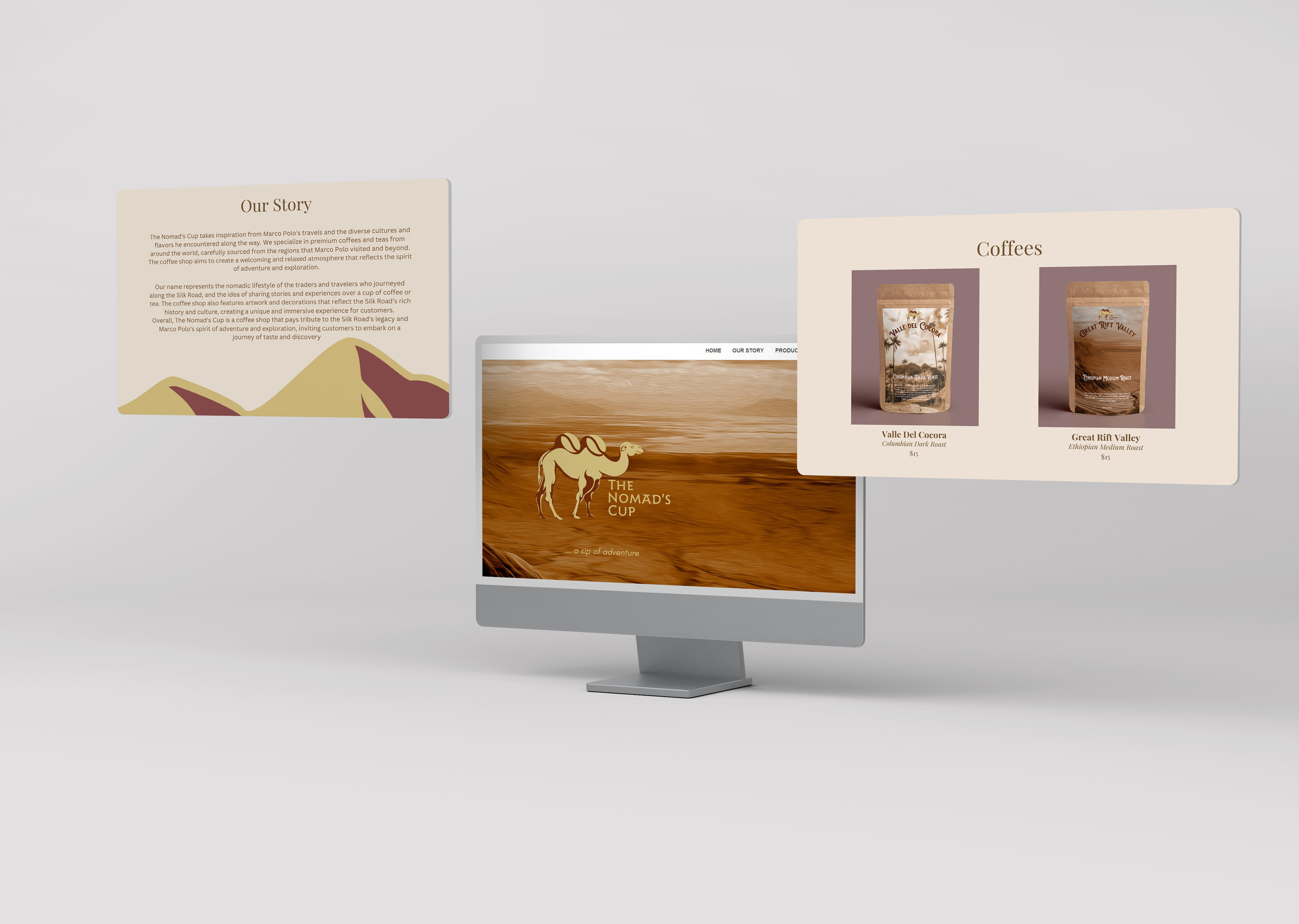 The colour pallet is minimal, with beiges and browns that serve as a reminder of the Gobi Desert that Marco Polo had crossed on his adventures. To further tell that story, the logo is a Bactrian Camel with coffee beans as humps. The details on the body are fluid and swirling, much like the swirl of cream being added to a cup of freshly brewed espresso.